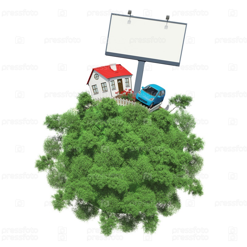 Автомобиль, дом, рекламный щит на маленькой зеленой планете с деревьями