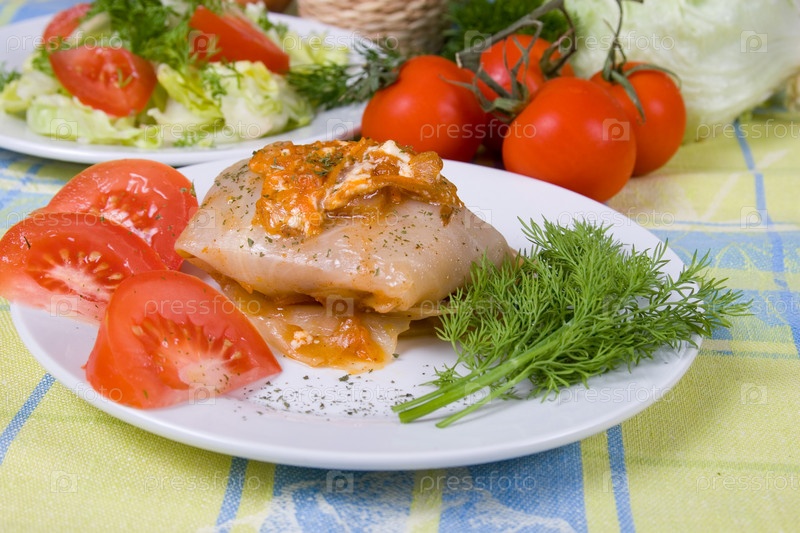 Порции голубцов и свежего салата на столе