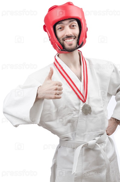 Каратист с медалью на белом фоне