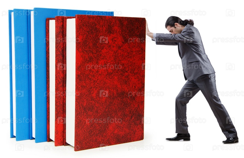 Предприниматель с книгами на белом фоне