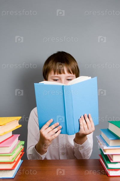 Мальчик читает книгу за столом на сером фоне