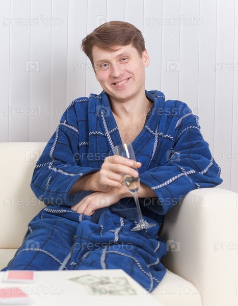 Молодой человек в синем халате с широкой улыбкой на лице и бокалом шампанского в руке