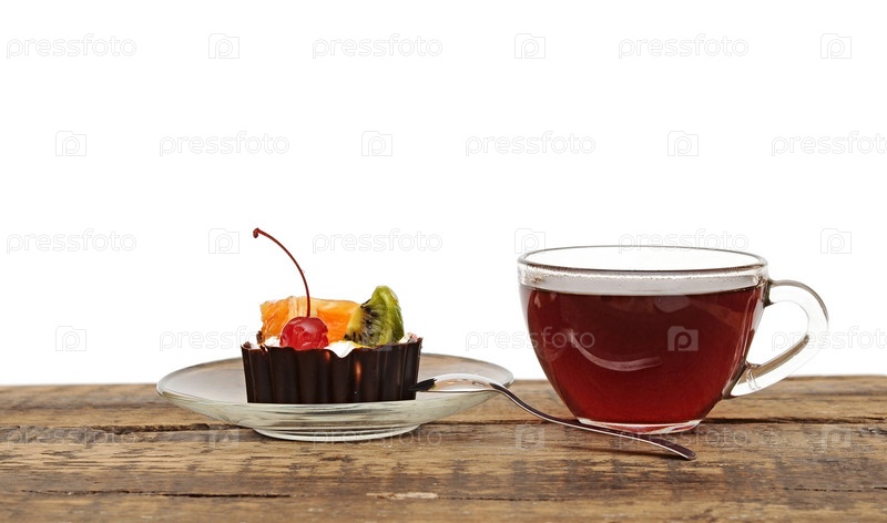 Пирожное с фруктами и чашка чая