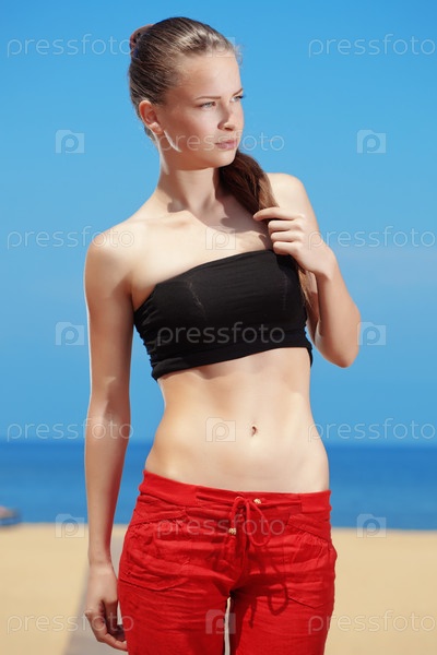 Молодая красивая женщина в спортивной одежде на пляже