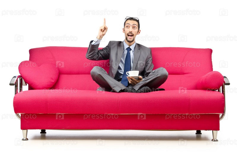 Деловой мужчина с чашкой чая сидит на малиновом диване с подушками в форме сердец