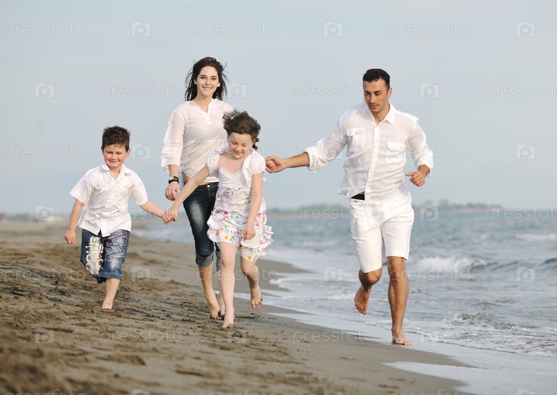 Счастливая молодая семья на берегу моря