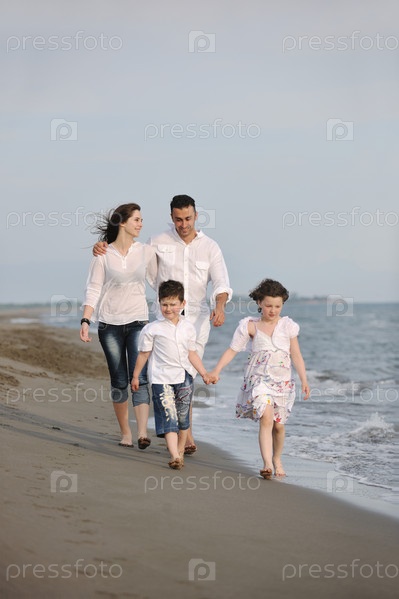 Счастливая молодая семья на берегу моря