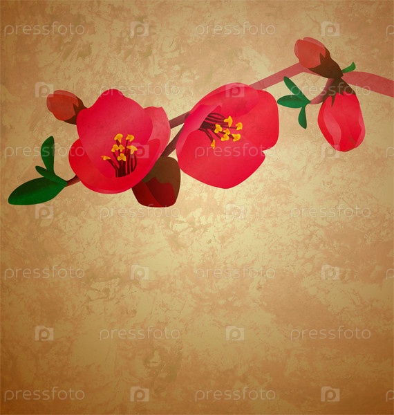 Красные цветы на ветке, коричневый фон