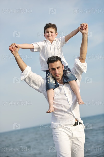 Счастливый молодой отец с сыном на берегу моря