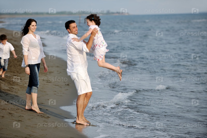 Счастливая молодая семья на морском пляже