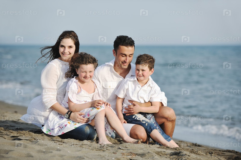 Счастливая молодая семья с двумя детьми отдыхают на морском пляже