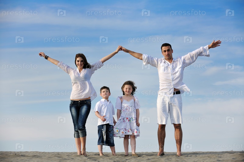Дети под защитой родителей на морском пляже