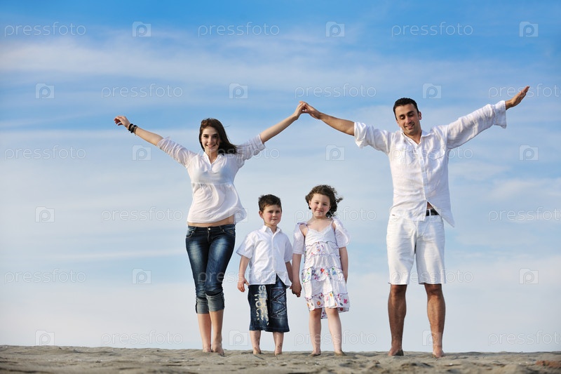 Дети под защитой родителей на морском пляже