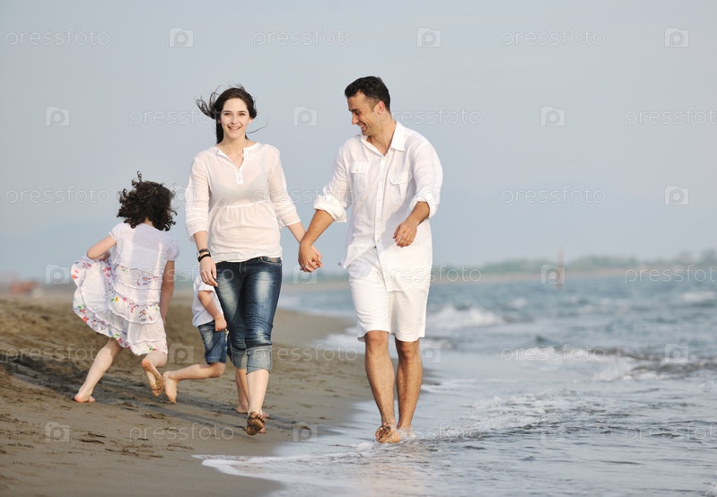 Молодая счастливая семья с детьми на морском пляже