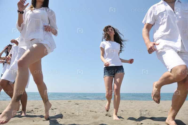 Группа отдыхающих, бегущая по морскому пляжу