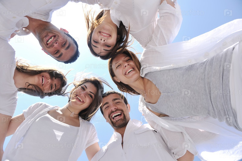 Группа счастливых молодых людей в кругу на пляже