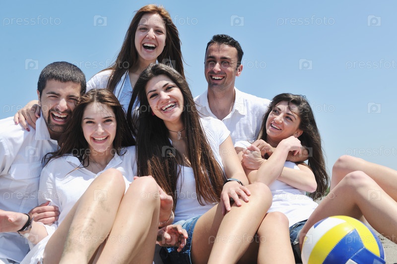 Портрет группы счастливых молодых людей на морском пляже с мячом
