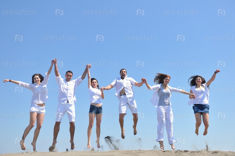 Группа счастливых молодых людей на морском пляже
