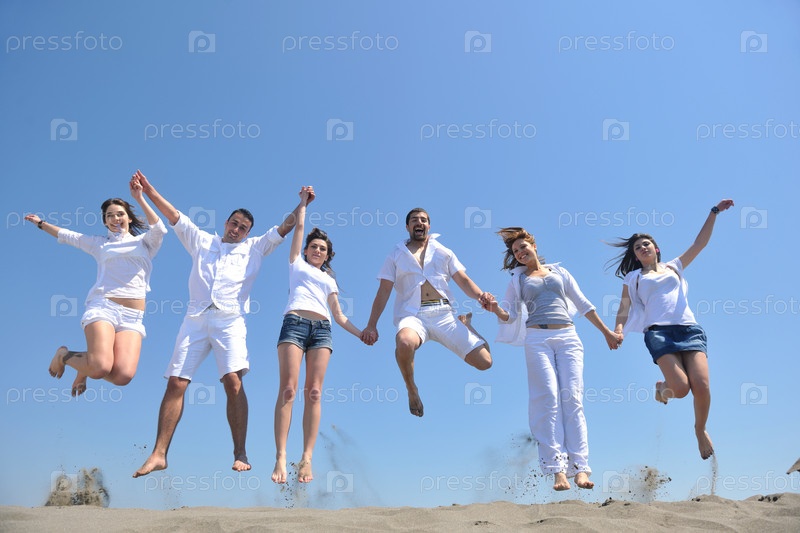 Группа счастливых молодых людей на морском пляже