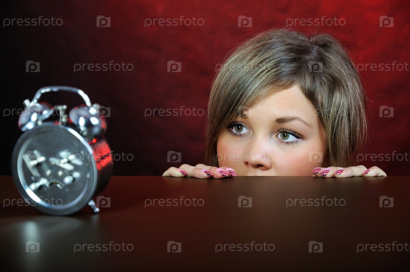 Девушка смотрит на будильник