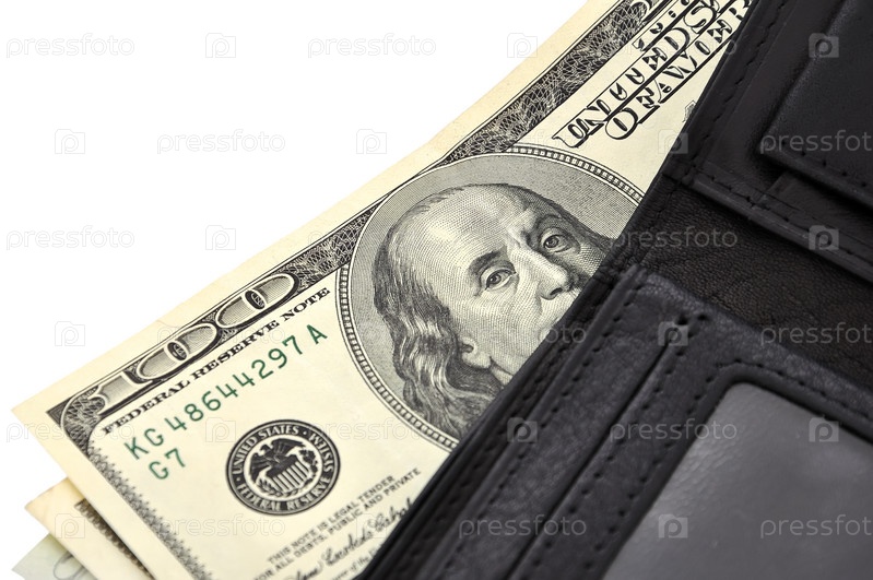 Доллары в кожаном портмоне крупным планом на белом фоне