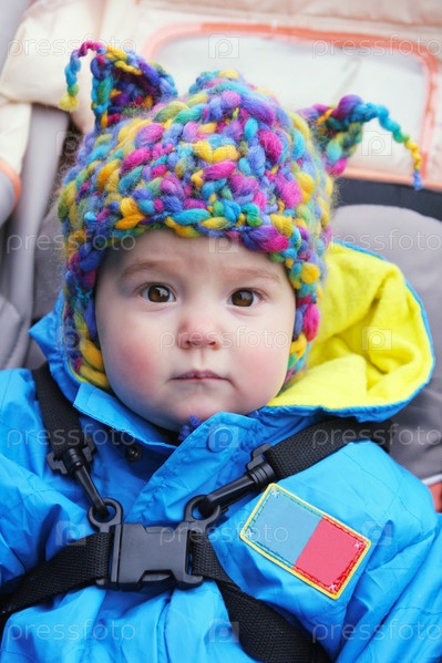 Маленький ребенок в вязаной шапке с ушками сидит в коляске