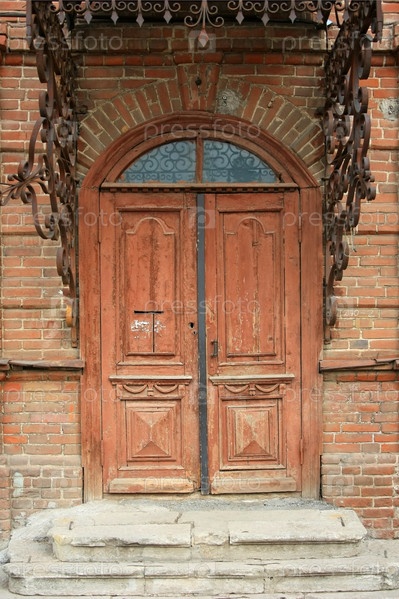 Старая деревянная дверь в кирпичном здании