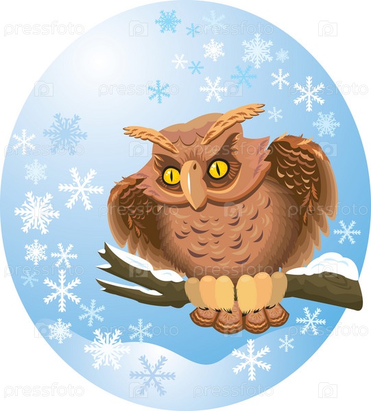 Нарисованный филин сидит на ветке на фоне снежинок