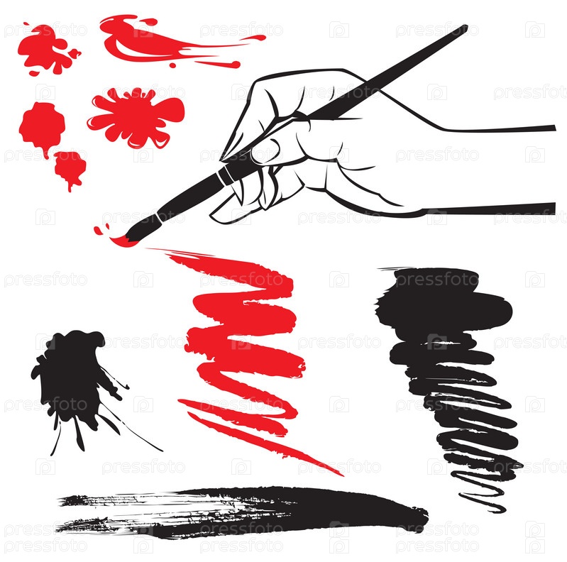 Рука с кистью и пятнами краски на белом фоне