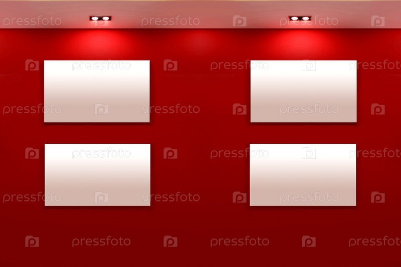 Интерьер галереи с пустыми рамами на красной стене