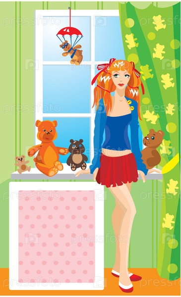 Девушка стоит у окна в комнате с игрушками