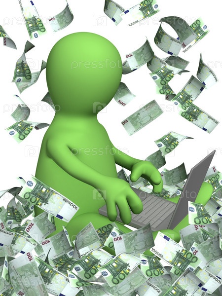 Человечек с ноутбуком на фоне падающих банкнот