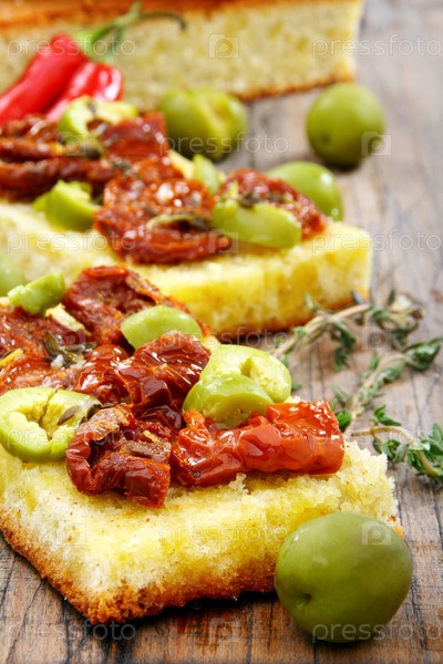 Хлеб с оливками и сушеными томатами на деревянном столе