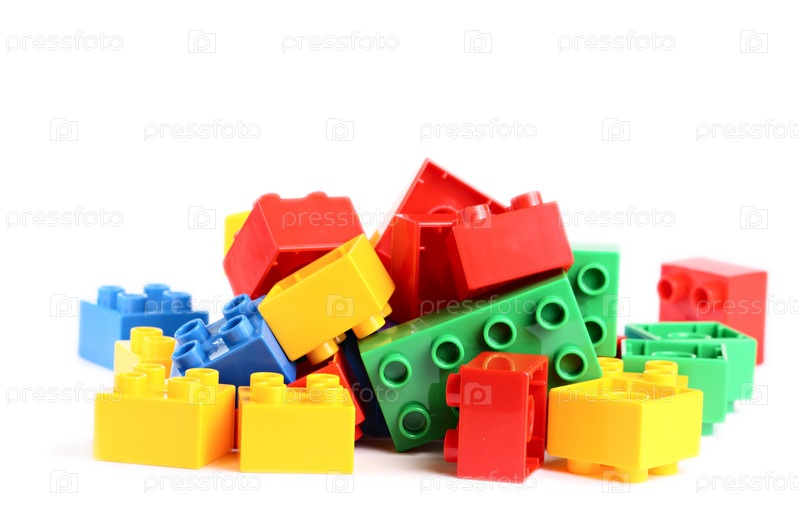 Набор цветных блоков детского конструктора на белом фоне