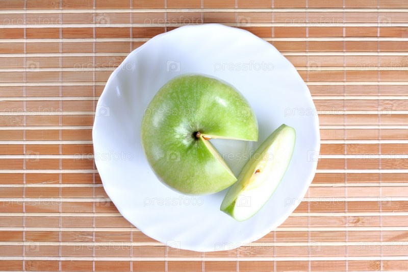Зеленое яблоко с отрезанным куском на блюдце