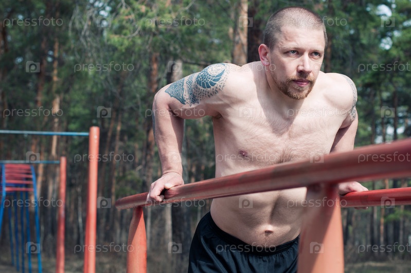Молодой спортсмен, выполняющий отжимания на брусьях