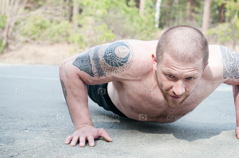 Молодой мужчина, выполняющий отжимания на дороге