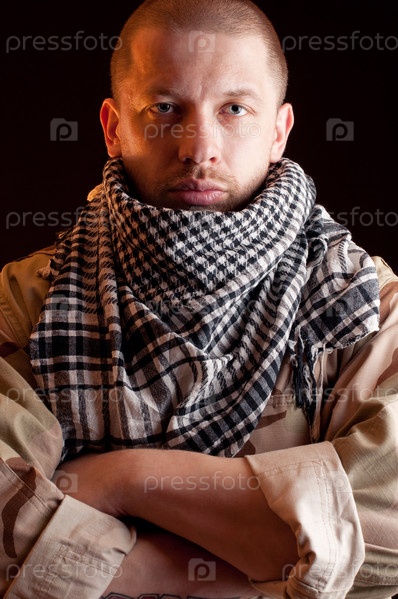 Портрет наемника в камуфляже на черном фоне