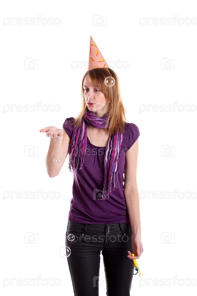 Девушка в колпаке с мыльными пузырями на белом фоне