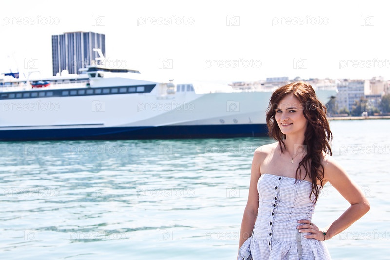 Портрет молодой и красивой девушки на фоне круизного лайнера