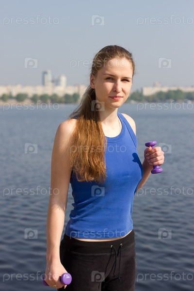 Девушка в спортивной форме с гантелями тренируется на набережной улице города