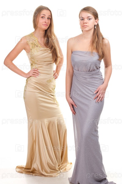 Две девушки в золотом и серебряном платьях позируют на белом фоне