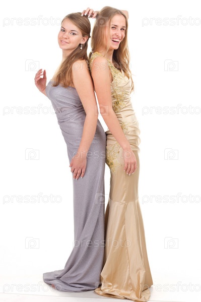Две девушки в золотом и серебряном платьях позируют на белом фоне