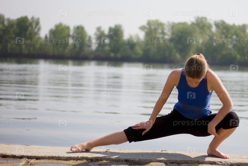 Женщина занимается йогой на берегу реки