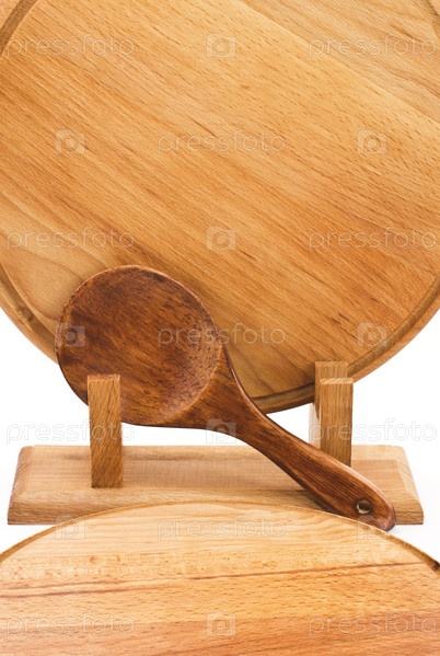 Две деревянные разделочные доски с подставкой и деревянной ложкой на белом фоне