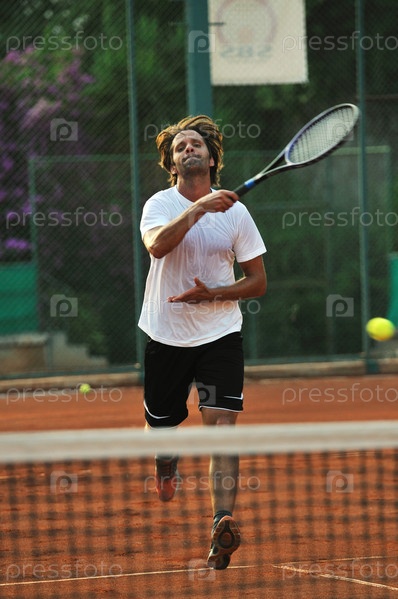 Молодой человек играет в теннис на открытом воздухе