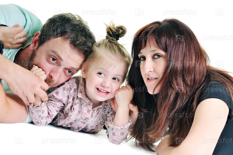 Молодая счастливая семья, изолирована на белом фоне, студийный портрет