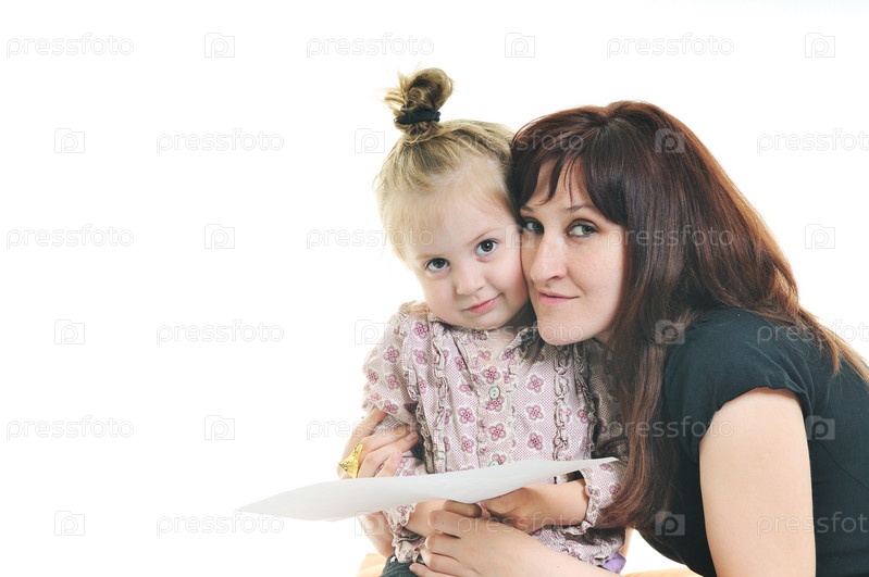 Счастливая молодая мать с дочкой на белом фоне