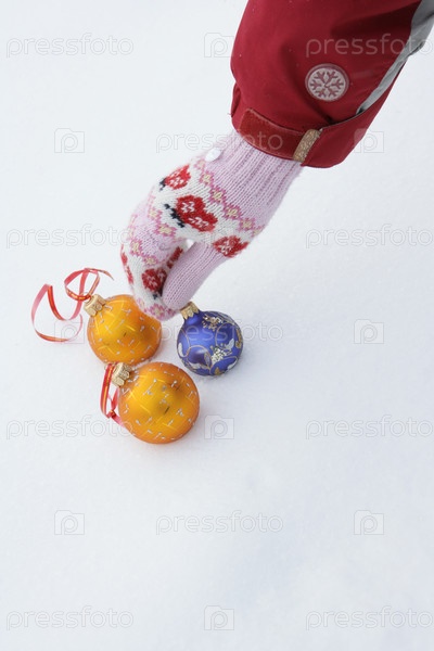 Рука и новогодние игрушки на снегу