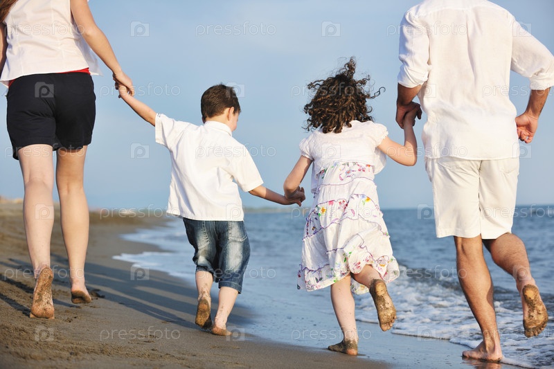 Счастливая молодая семья на пляже